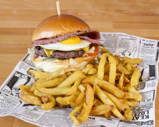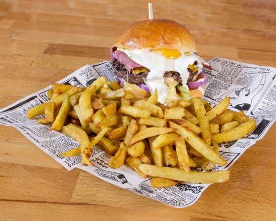 Pain rond brioché, salade, tomates, oignons rouges, cornichons, steak farci de boeuf, oeuf, cheddar fondu