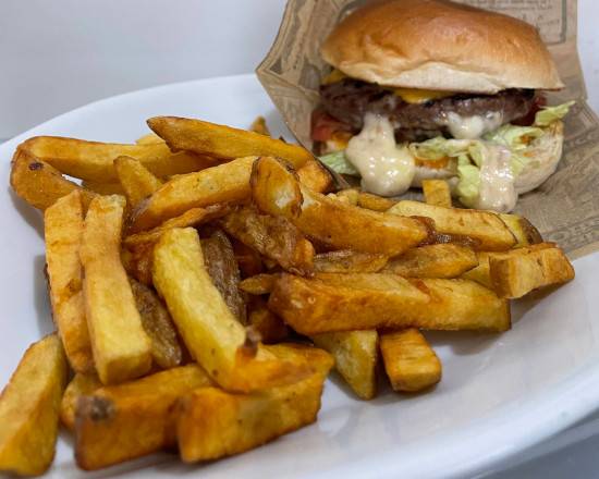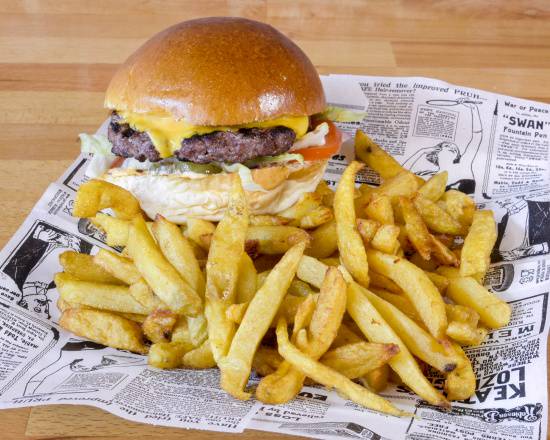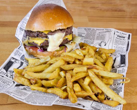 Pain rond brioché, salade, tomates, oignons rouges, cornichons,2 steaks farcis au fromage, cheddar tranche