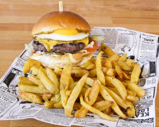 Pain rond brioché, salade, tomates, oignons rouges, cornichons, steak farci au fromage, oeuf, bacon, sauce fromagère